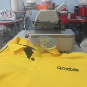 Thiết kế mẫu áo thun đồng phục Q-mobile: Chất liệu vải cá mập, màu vàng ngệ, theo màu chuẩn của logo công ty Q-Mobile. Quy cách may: áo thun có cổ, tay bo